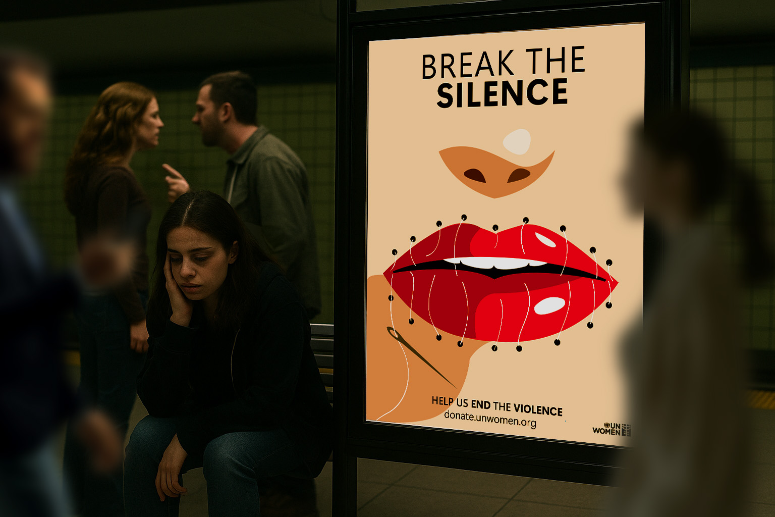 “Break the Silence” is a social awareness campaign addressing emotional and verbal abuse against women. The stitched red mouth symbolizes the forced silence of victims, while bold typography calls for action. To bring the message to life, I created a cinematic subway mockup featuring a distressed woman and a couple arguing in the background. Blurred commuters walking by reflect society’s tendency to overlook silent suffering. This project blends design and storytelling to highlight the urgency of speaking up against gender-based violence.