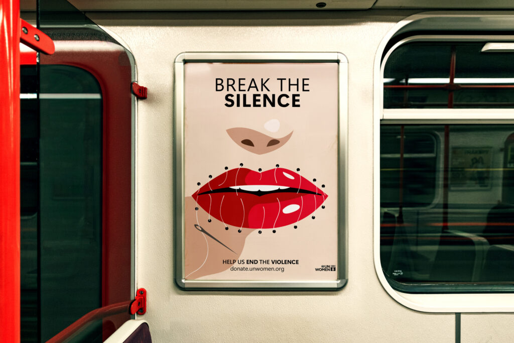 “Break The Silence” is a conceptual awareness campaign designed to support UN Women’s efforts to end gender-based violence. The powerful visual metaphor red lips sewn shut represents the silencing of women’s voices due to abuse, fear, or societal stigma. This campaign aims to provoke public awareness, initiate conversations, and encourage donations to support survivors of violence.