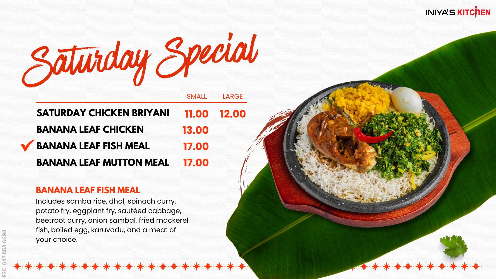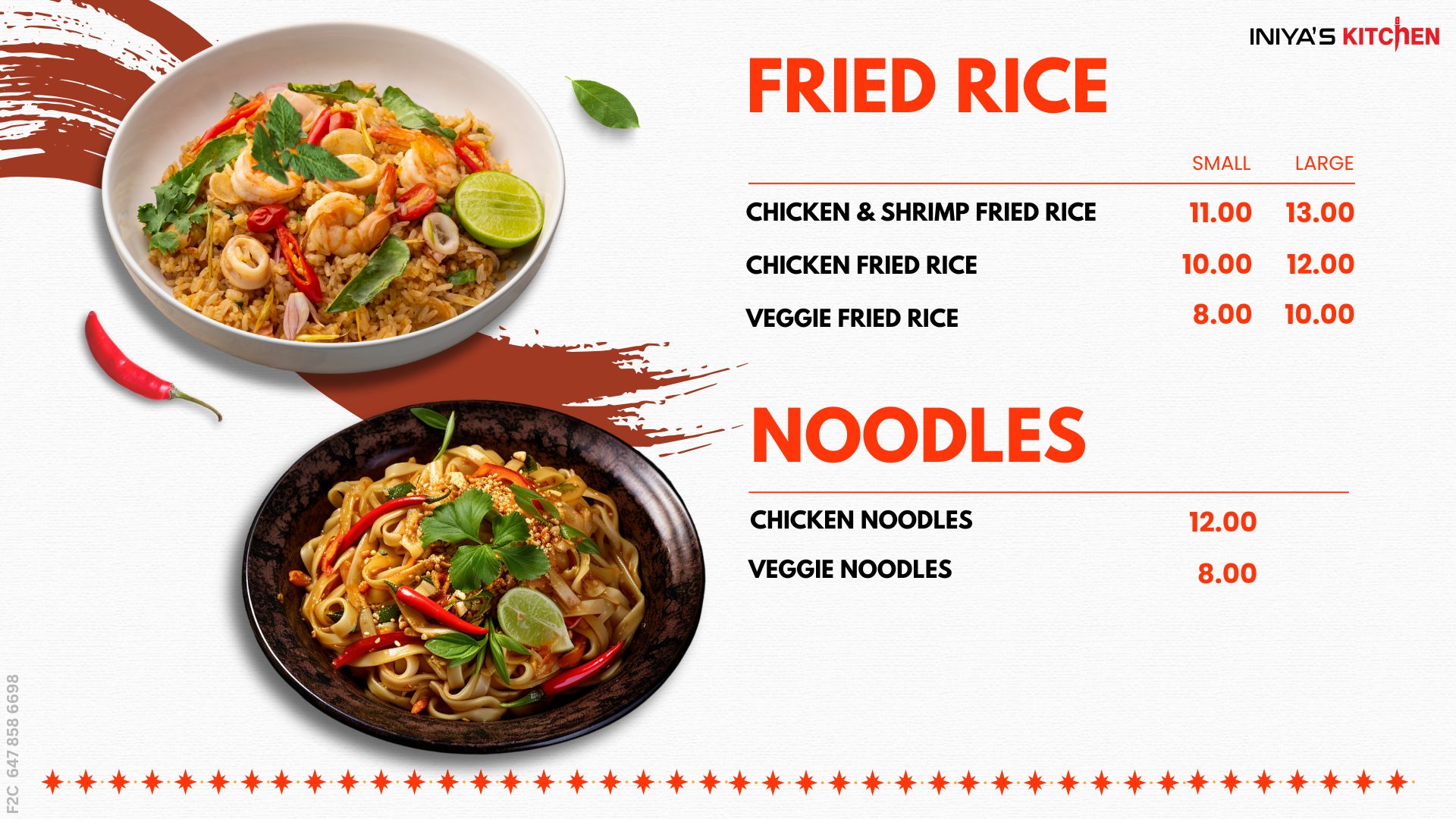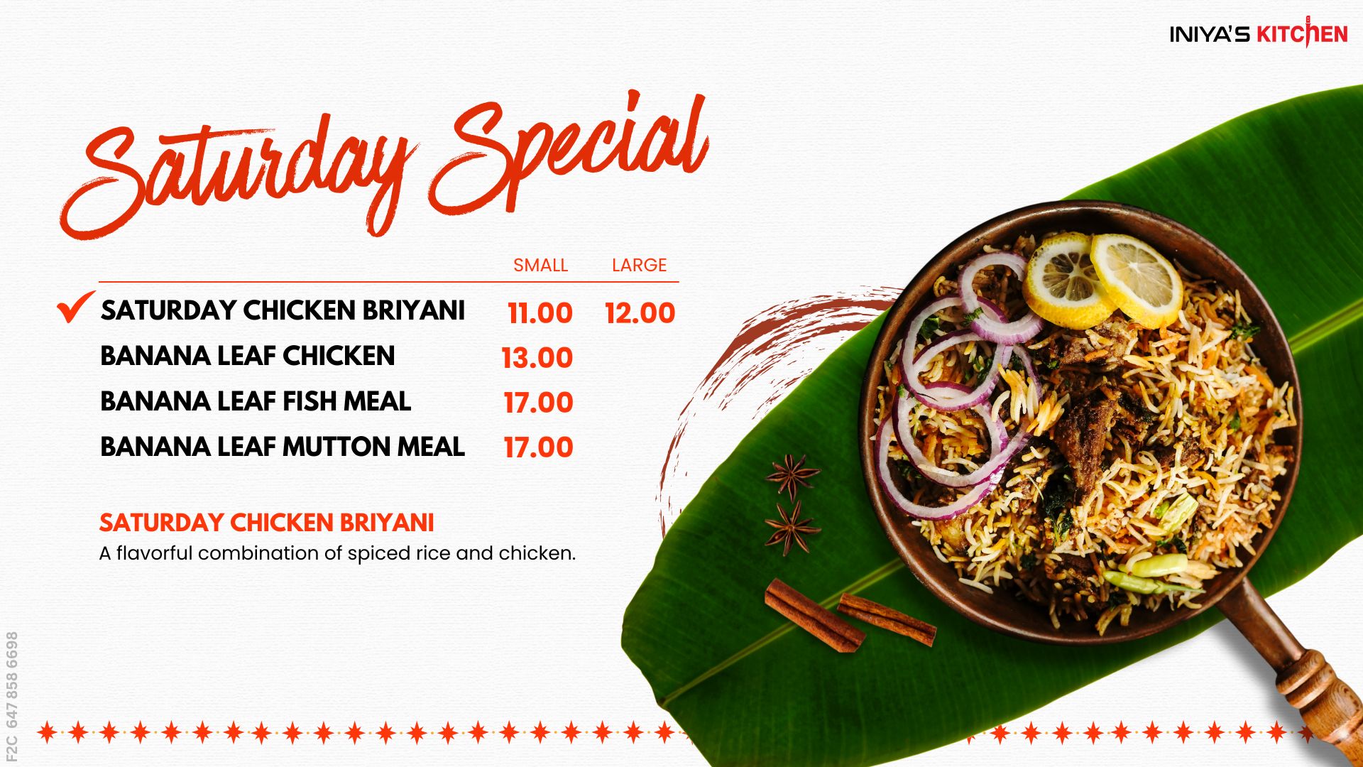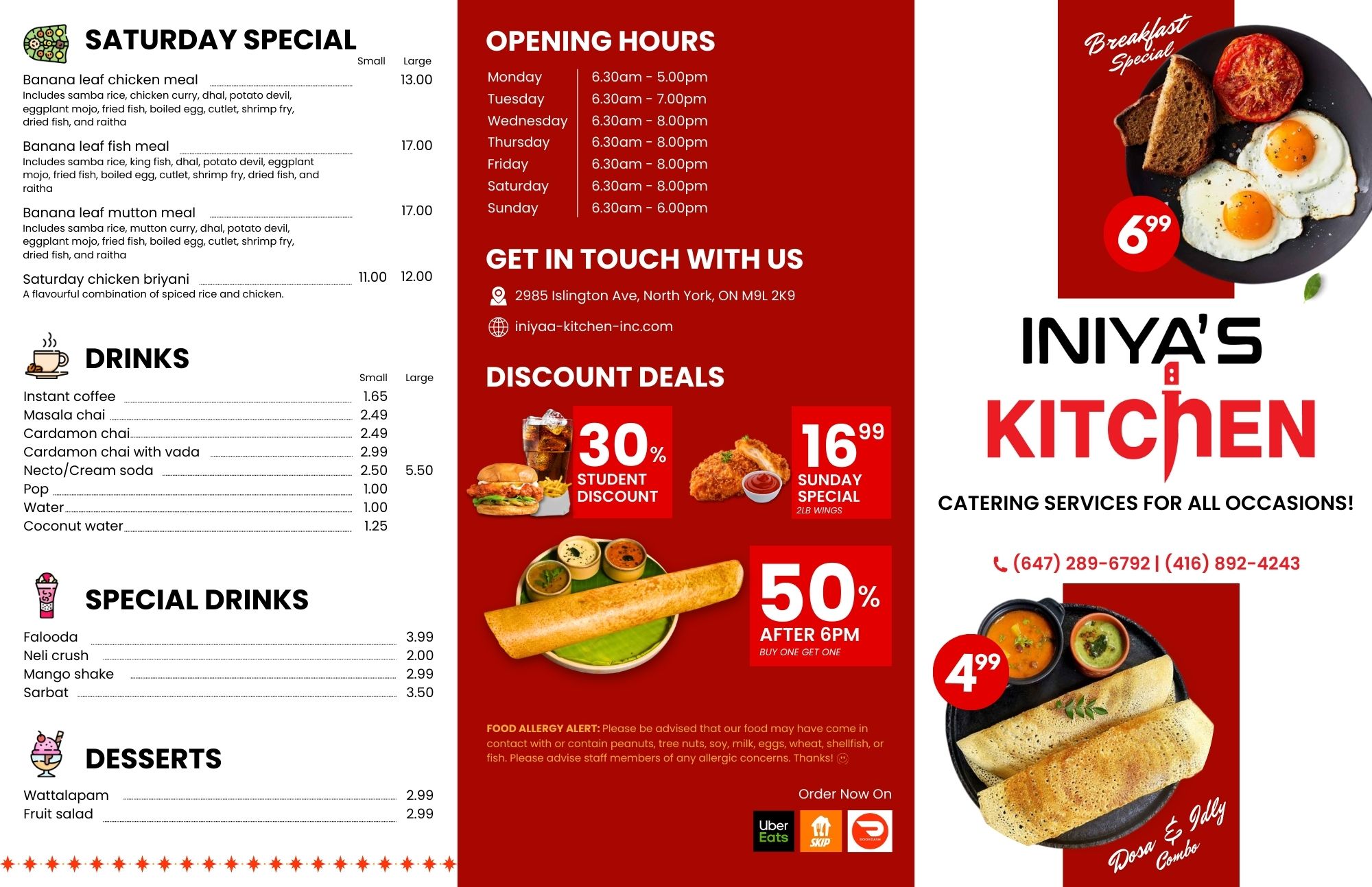This project was created for Iniya’s Kitchen, a Tamil-Sri Lankan restaurant, where I was responsible for designing the digital TV screen menus and printed brochures. The goal was to showcase the restaurant’s diverse offerings from traditional biryanis and banana leaf meals to burgers and fries in an organized and visually engaging way for takeout customers.
