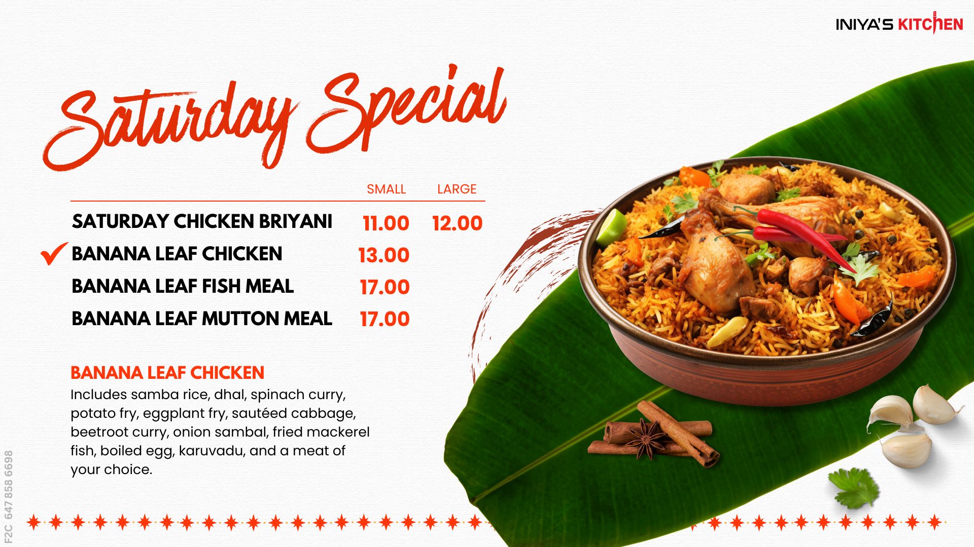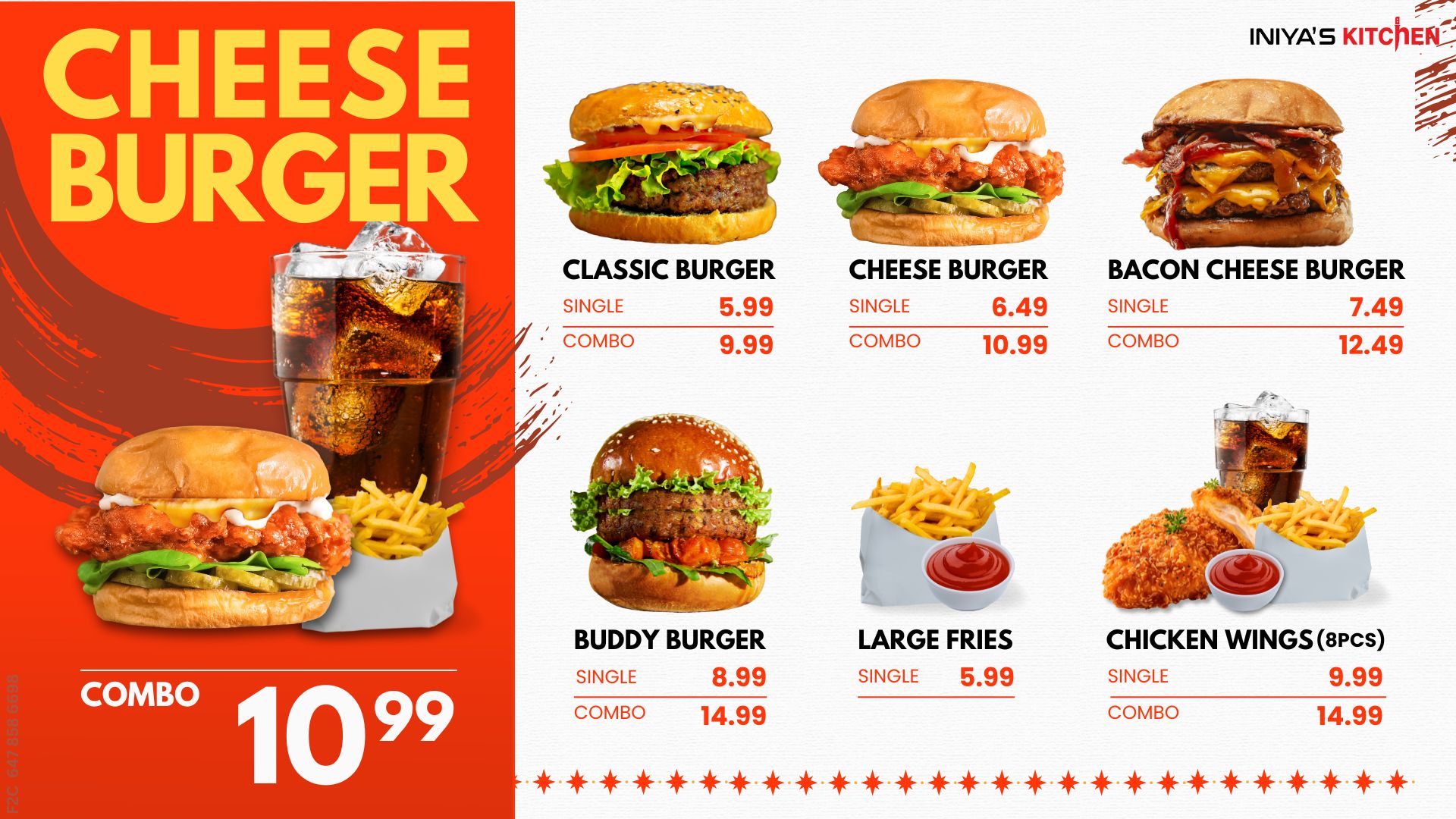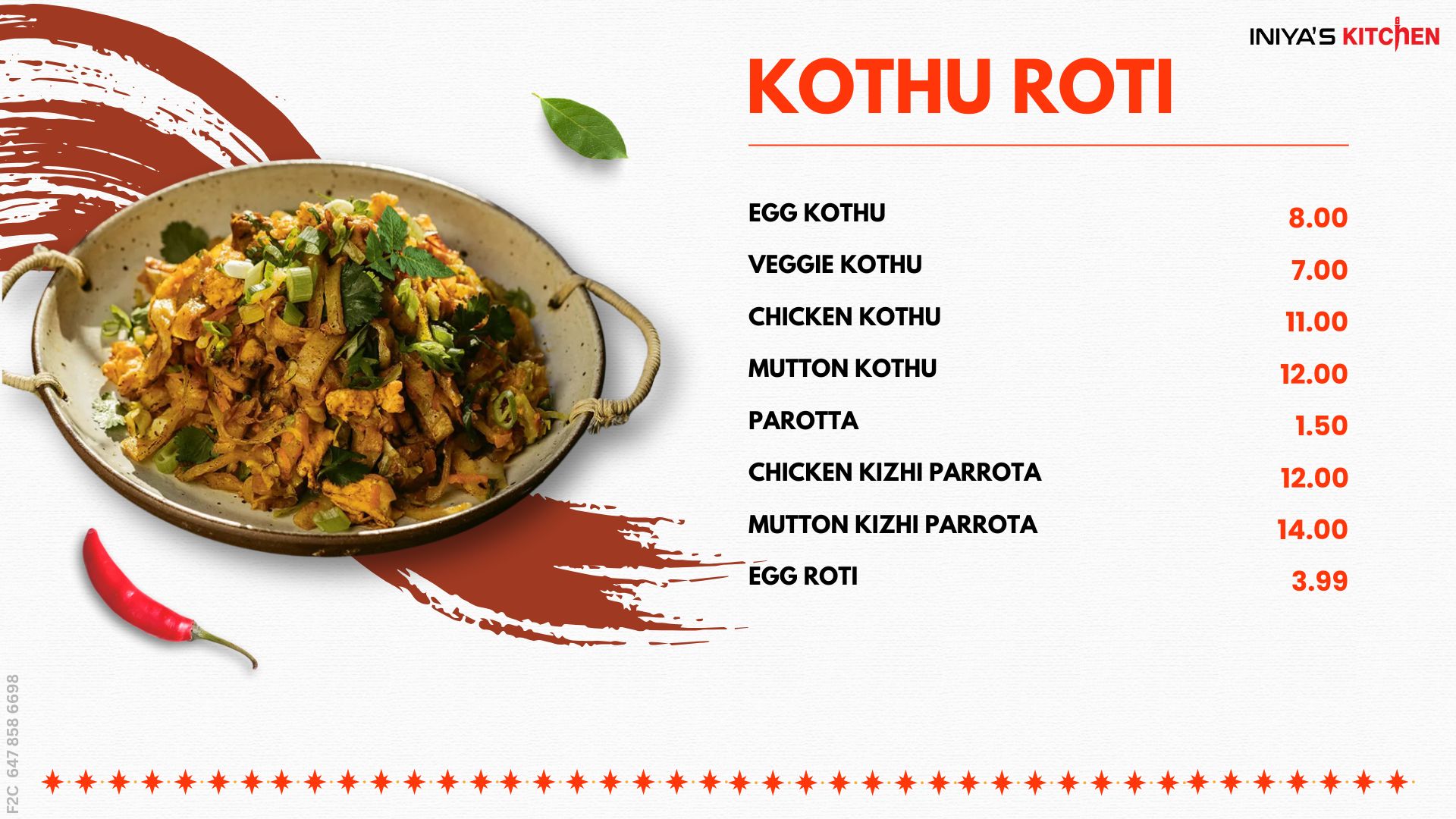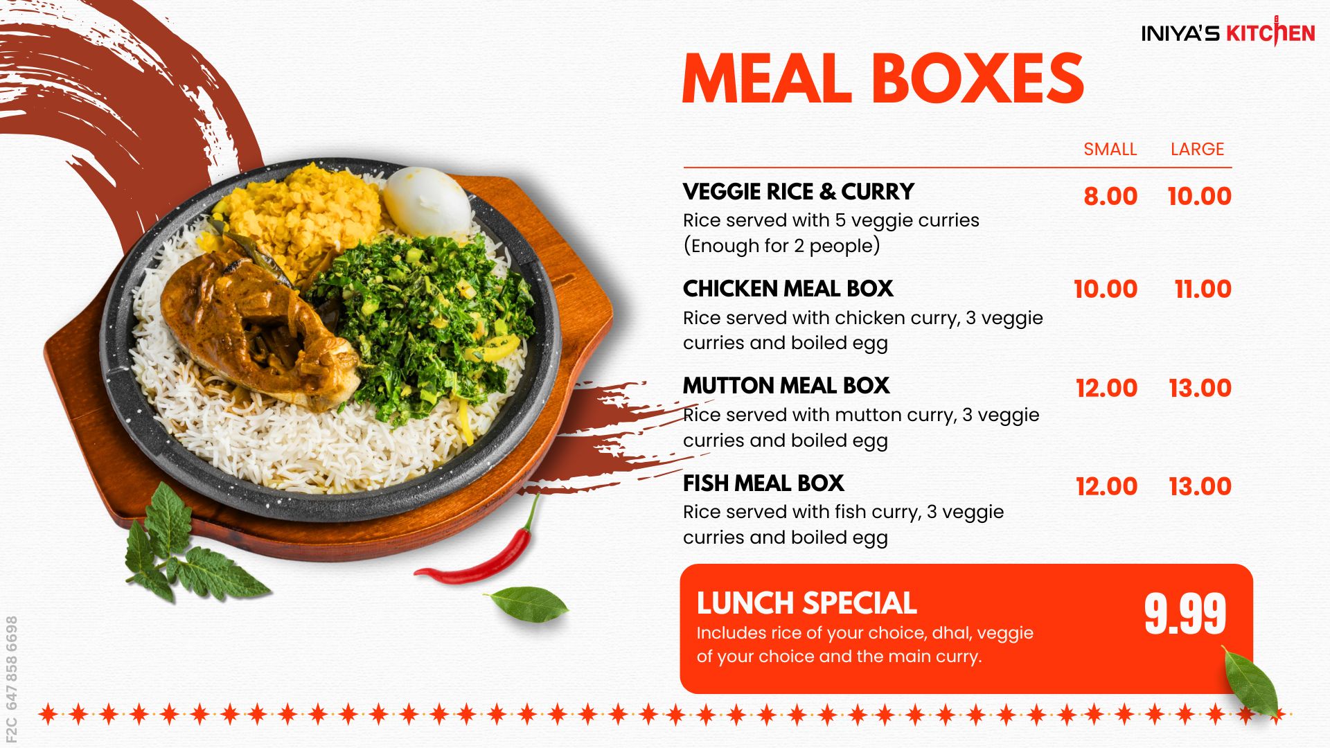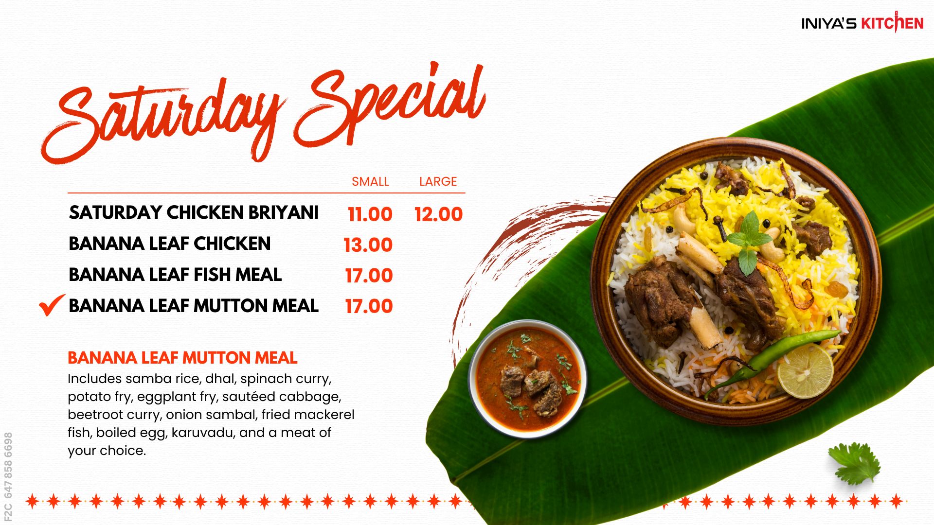 This project was created for Iniya’s Kitchen, a Tamil-Sri Lankan restaurant, where I was responsible for designing the digital TV screen menus and printed brochures. The goal was to showcase the restaurant’s diverse offerings from traditional biryanis and banana leaf meals to burgers and fries in an organized and visually engaging way for takeout customers.