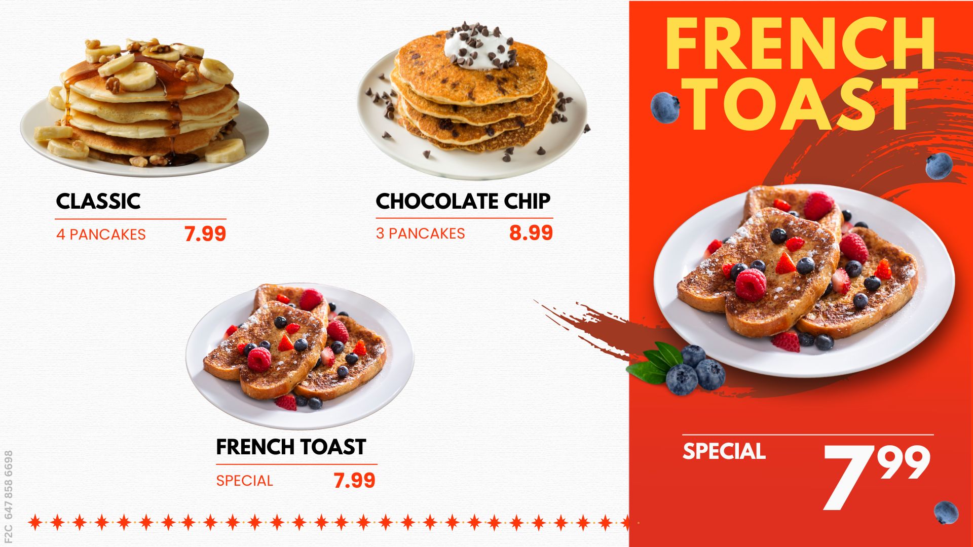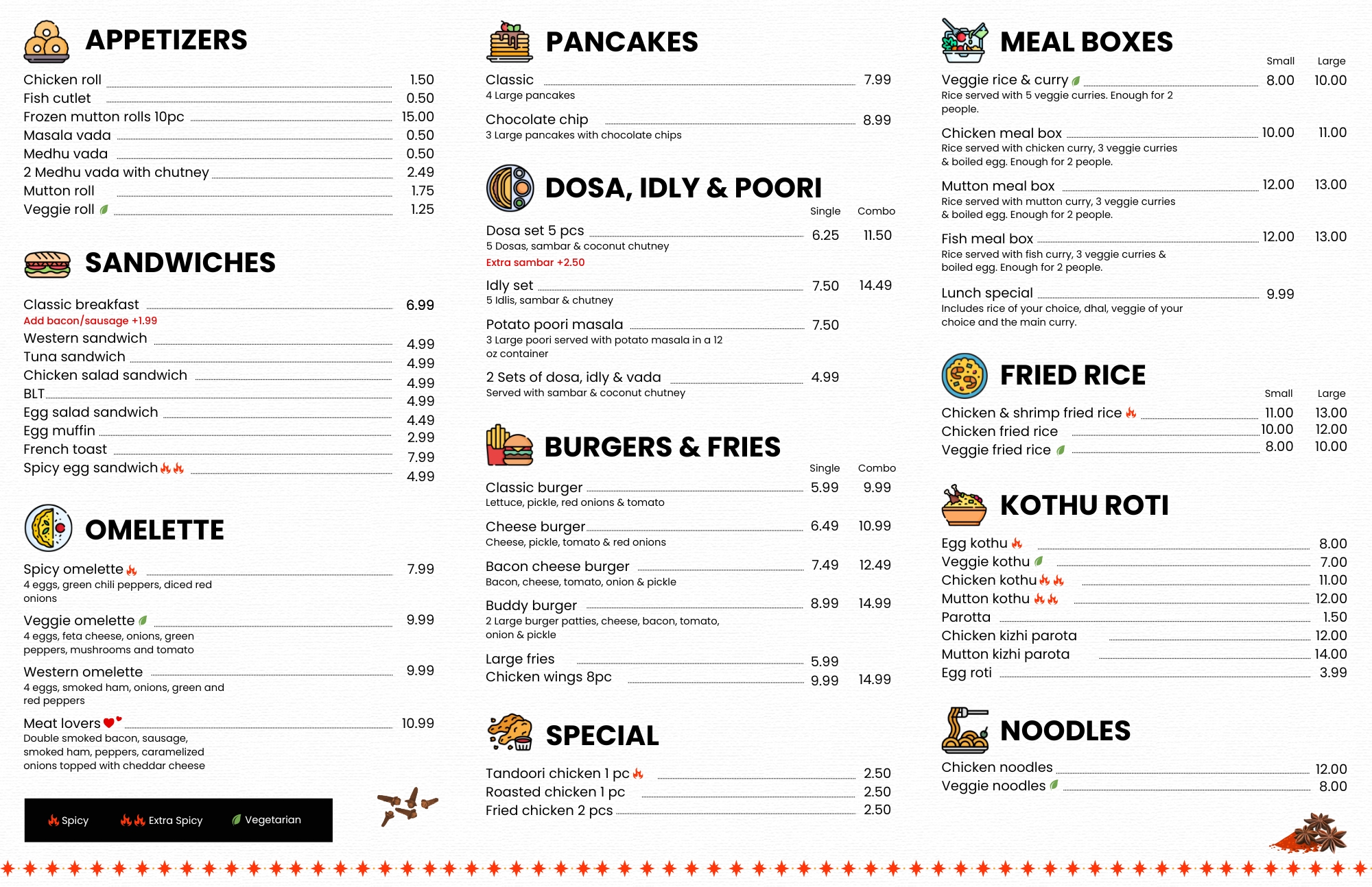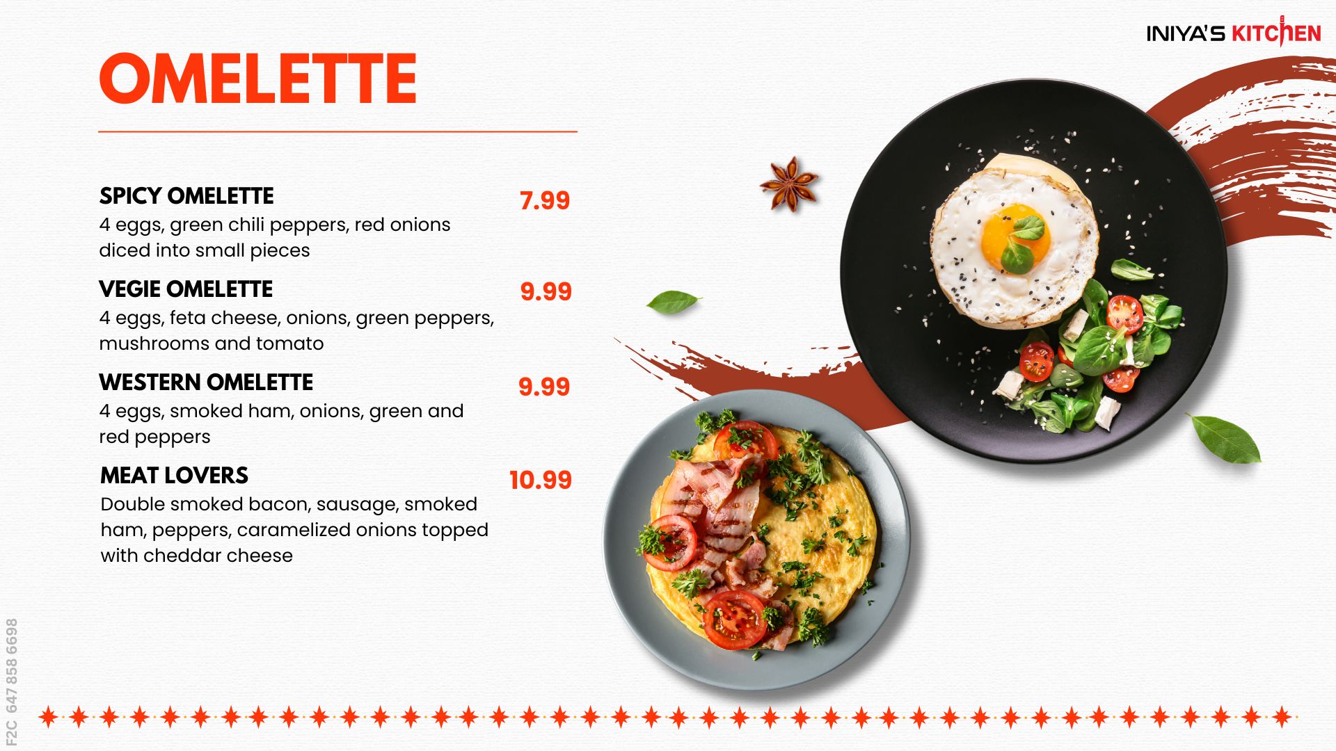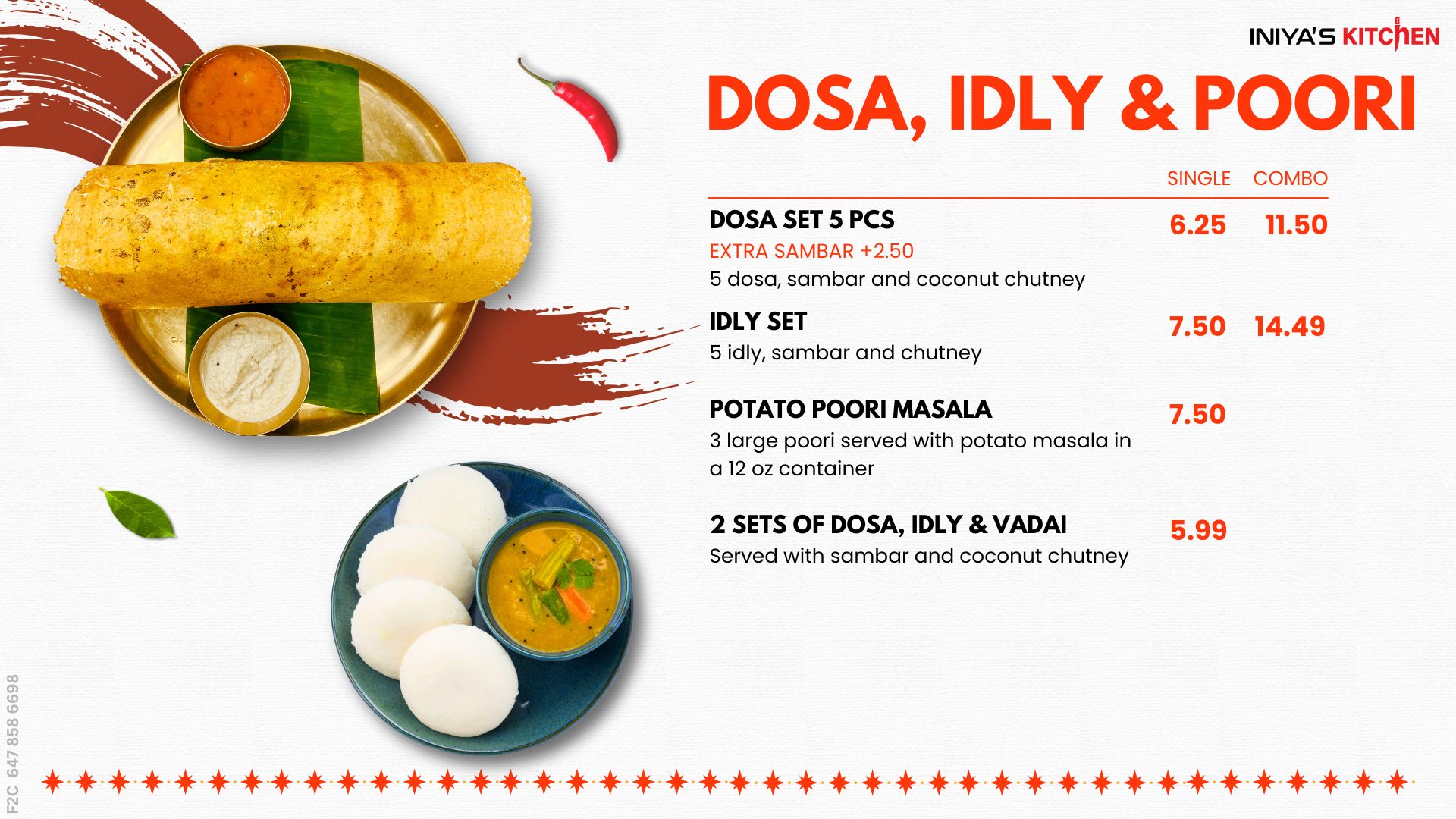This project was created for Iniya’s Kitchen, a Tamil-Sri Lankan restaurant, where I was responsible for designing the digital TV screen menus and printed brochures. The goal was to showcase the restaurant’s diverse offerings from traditional biryanis and banana leaf meals to burgers and fries in an organized and visually engaging way for takeout customers.