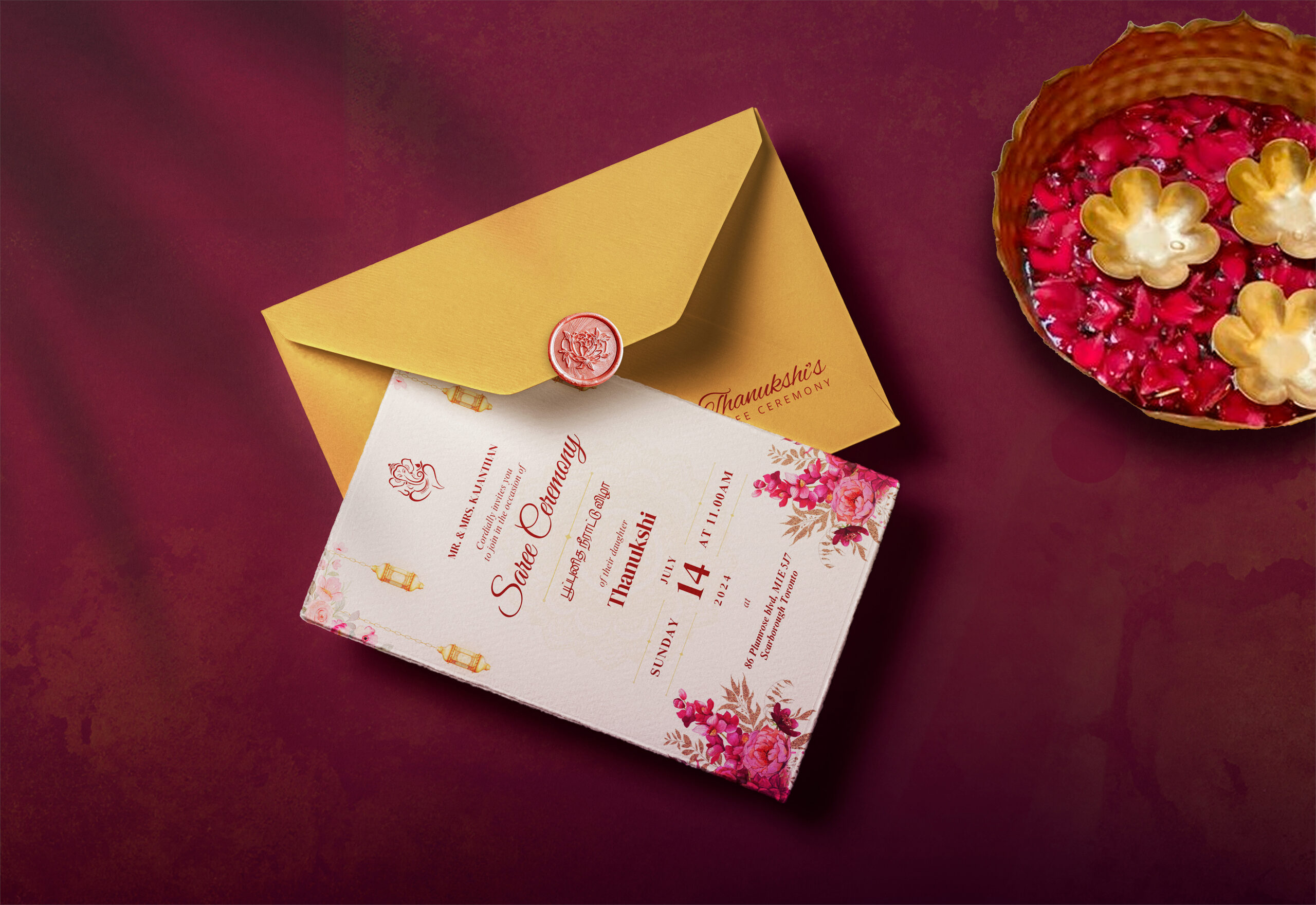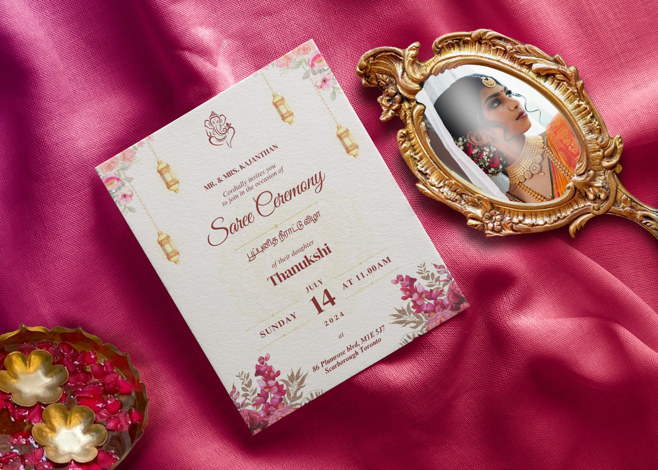 The Saree Ceremony is a cherished Hindu tradition marking the transition of young girls into adulthood, celebrating their first period. This ceremony welcomes them into womanhood with joy and reverence. During this rite of passage, the girl wears a saree for the very first time, symbolizing her maturity and the traditional attire of Hindu women. This summer we celebrated my cousin’s beautiful journey into adulthood with this special invitation.