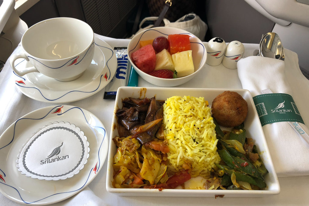 Okay, first, let’s talk food. Sri Lankan Airlines knows what they’re doing. One of the best dishes they serve is Lamprais, which is basically rice and curry wrapped up in a banana leaf, plus a crispy cutlet on the side. And of course, fresh fruit to round it out.